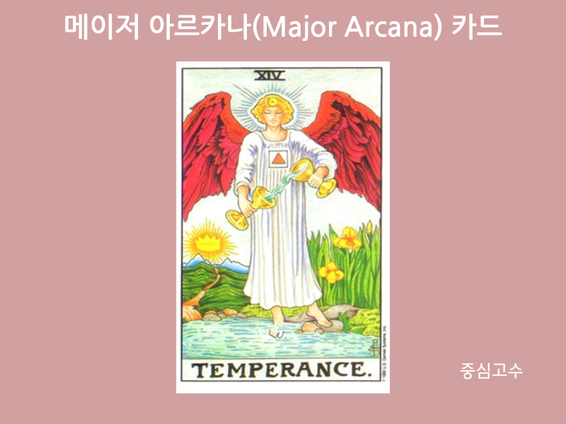 "A tarot card of 'Temperance' showing an angel pouring water between two cups, representing balance, moderation, and healing energy."