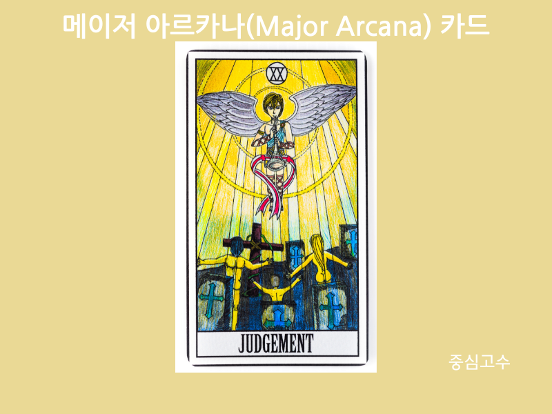 "A tarot card of 'Judgement' showing figures rising from graves, with an angel blowing a trumpet, representing rebirth, renewal, and self-reflection."